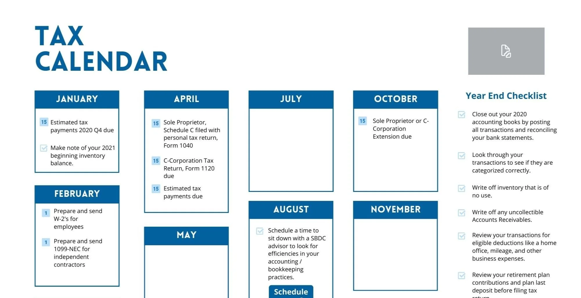 One of the most important things as a new business owner is to stay on top of taxes. We’ve compiled a calendar of all the dates you need to keep in front of you to run your business like a pro. We’ll get a magnetic copy to you in the mail (but we want selfies with your magnet!).